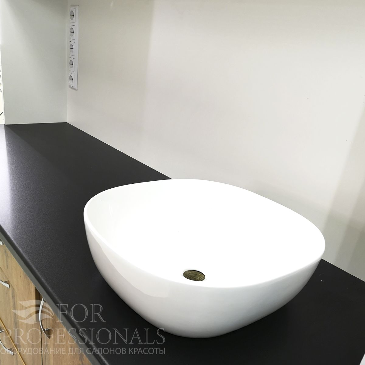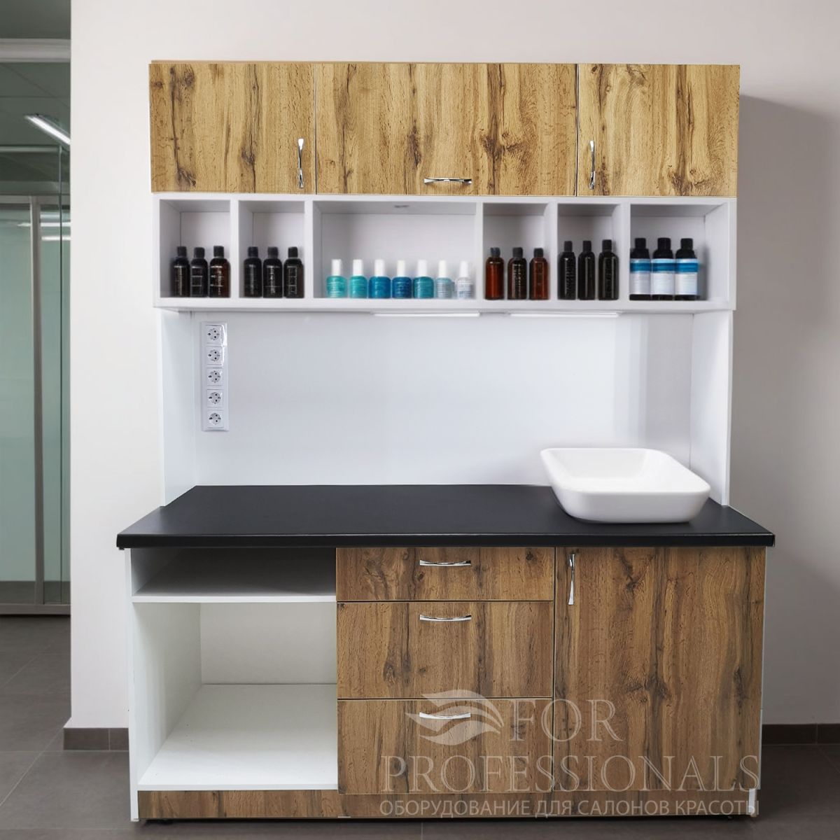 Этот функциональная и элегантная лаборатория объединяет в себе рабочую поверхность для выполнения процедур, удобную раковину для мытья волос, а также многочисленные отделения для хранения инструментов и расходных материалов.