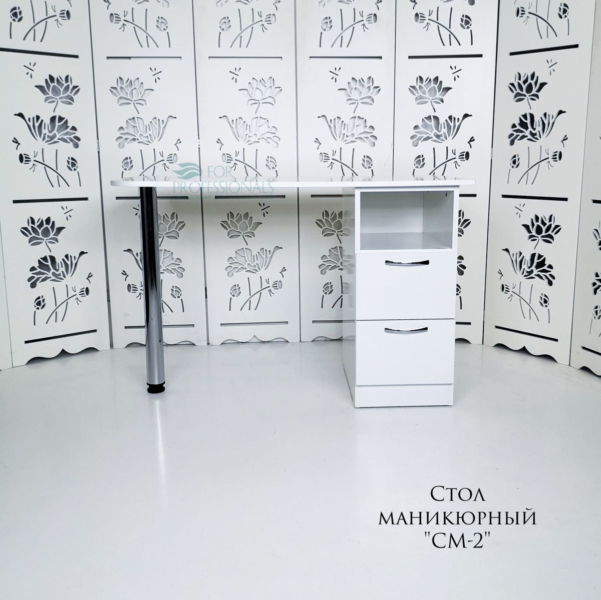 Удобный маникюрный столик с двумя выкатными ящиками, открытой полочкой и столешницей на тонкой ножке.