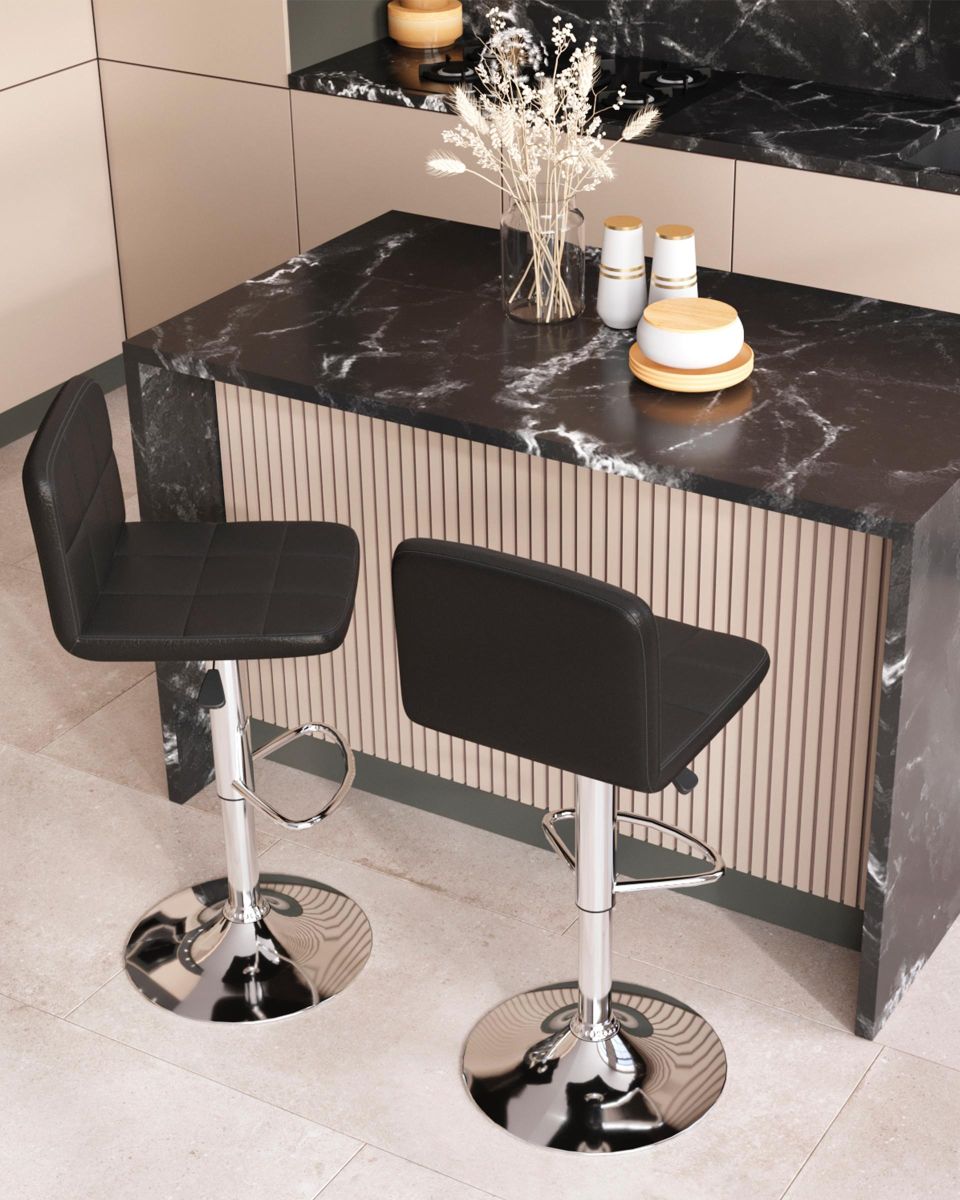 Изысканный и лаконичный барный стул «Квадро-2» – это идеальный вариант для домашней кухни, бара, ночного клуба, салона красоты или парикмахерской. Прочнейший каркас этого изделия в стиле баухаус изготовлен из хромированного металла, что одновременно и практично, и эстетично. Долговечная обивка из экокожи не требует особого ухода и легко очищается от загрязнений. Высота изделия регулируется в пределах 20 см. Устойчивая база из стали диаметром 385 мм обеспечивает безопасное использование. Поворотно-подъемный механизм газ-лифт выдерживает нагрузку до 120 кг.