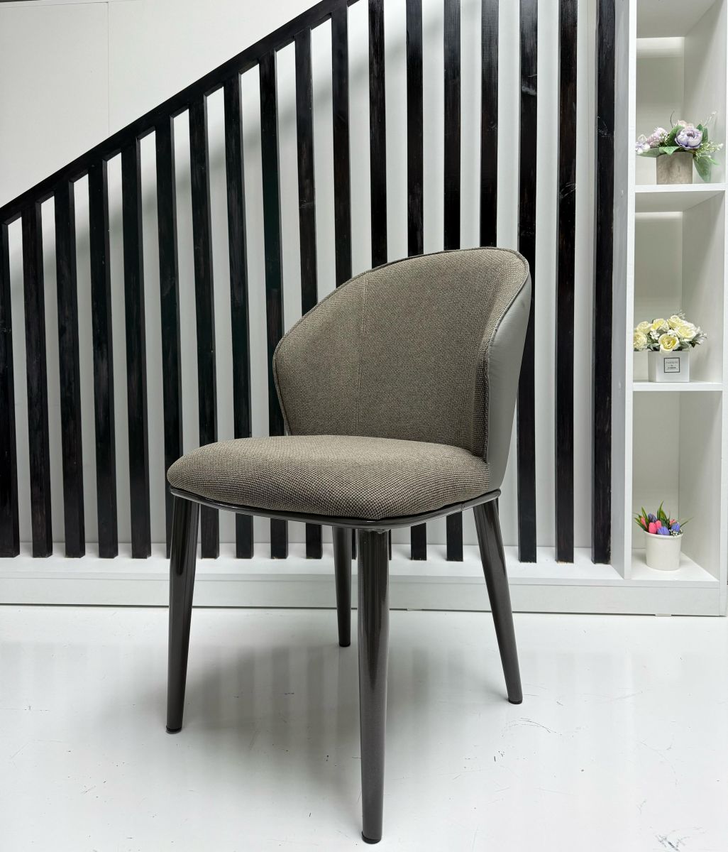 Сиденье и внутренняя часть спинки обтянуты тканью рогожка - прочным, дышащим материалом с характерной текстурой. Наружная часть спинки выполнена из коричневой экокожи, устойчивой к истиранию и простого в уходе. Чёрные металлические ножки добавляют модели устойчивости и визуальной строгости. Стул выдерживает нагрузку до 120 кг.