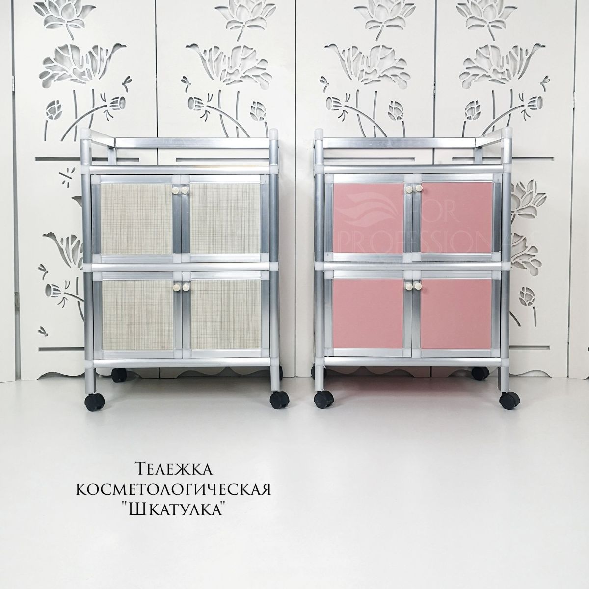 Лёгкая алюминиевая конструкция с двумя симпатичным ящичками, которая стоит на пластиковых колесиках, что позволяет бесшумно передвигать тележку по любой поверхности.