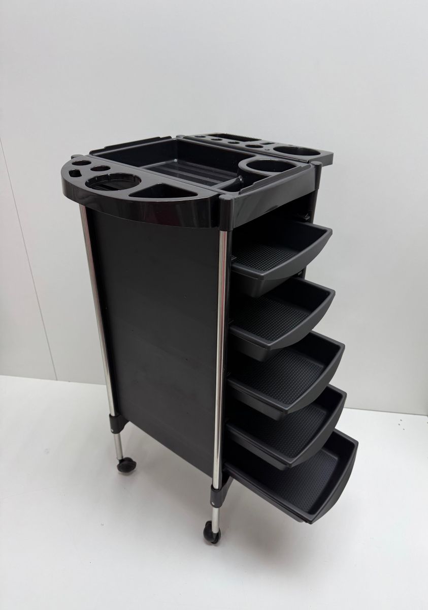 Какой должна быть идеальная парикмахерская тележка? Мобильной, лёгкой, разборной! Тележка "For Professionals"пять выдвижных поддона-ящичка, откидные ушки-подставки, легко перемещается на колёсиках. Стильный чёрный цвет подойдёт к любой обстановке, тележка достаточно высокая, чтобы не пришлось нагибаться и тянуться.